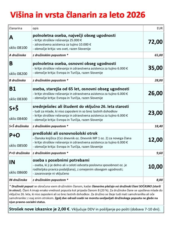 Višina članarine je nekoliko višja kot pretekla leta, zavarovanje in zavarovalni pogoji pa ostajajo enaki.