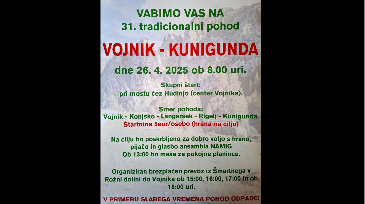 V soboto, 25.4.2026 ob 08.00 uri Zberemo se na parkirišču trgovine Mercator, od koder se s svojimi vozili odpeljemo proti Polzeli oziroma do parkirišča v naselju Podvin pod Vinskim vrhom (Vimperkom), kjer se bo pričel osmi del naše poti po SAVINJSKI PLANINSKI POTI. S parkirišča bomo krenili po makadamskem kolovozu proti vrhu Vinskega vrha, kamor [...]
