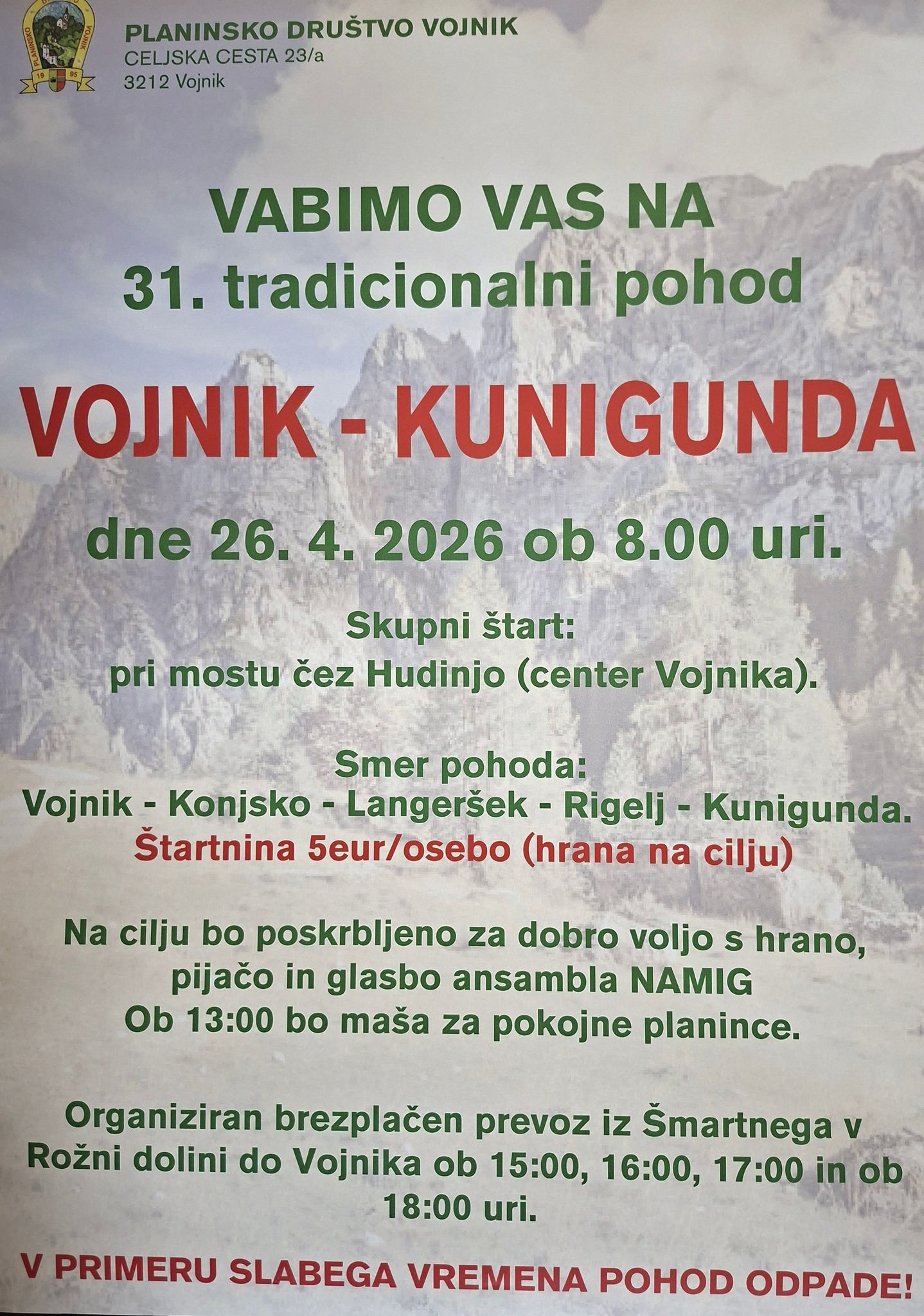Vabilo na 31. tradicionalni pohod Vojnik–Kunigunda Planinsko društvo Vojnik vas vljudno vabi, da se jim pridružite na 31. tradicionalnem pohodu Vojnik–Kunigunda, ki bo v nedeljo, 26. aprila 2026, ob 8.00. [...]